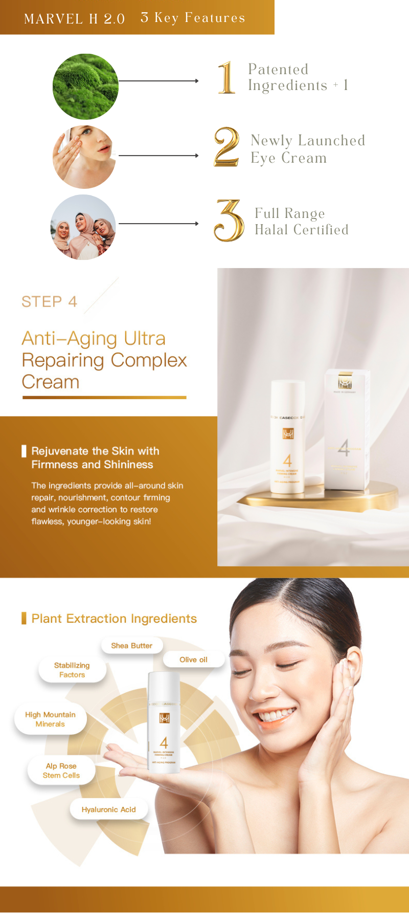 Our brand-new MARVEL H2.0 series builds upon the tried-and-true German water-locking protective film formula and incorporates the latest in Swiss biotech innovations. What's more, we've included a powerful anti-aging and revitalizing ingredient - Bonfire Moss, to provide a comprehensive solution for wrinkles and skin repair. For added peace of mind, the entire series is certified Halal by Malaysia JAKIM, ensuring it's suitable for Muslim users.